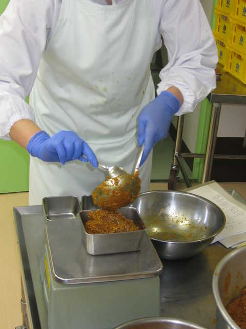 (4人分)小学生1人分の4人分量です。ご家庭で量を加減してお作りください。 コッペパンスライス :4個 玉ねぎ :80g[みじん切り] にんじん :32g[みじん切り] 豚ひき肉 :80g 植物油 :8g(小さじ2) 小麦粉 :6g(小さじ2) カレー粉 :0.8g(小さじ1/2弱) トマトケチャップ :24g(大さじ1と2/3) 赤ワイン :8g(大さじ1/2強) ウスターソース :12g(小さじ2) コンソメ :0.8g 卵 :16g パン粉(乾燥) :32g カレー粉 :0.4g(小さじ1/5) |
