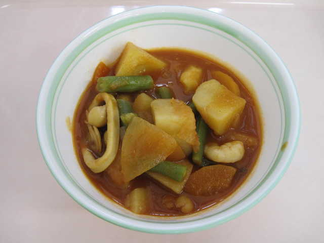 (4人分)中学生1人分の4人分量です。ご家庭で量を加減してお作りください。 いか(冷凍)…80g むきえび(冷凍)…80g 白ワイン …4g(小さじ4/5) 茹でたあさり(冷凍)…40g ひよこまめ(茹でたもの)…120g にんにく …2g じゃがいも …240g(中3個) 玉ねぎ …120g(大1個) にんじん …80g(中1本) さやいんげん …40g 植物油 …6g(大さじ1/2) 水 …120ml スープ …40ml ※湯にスープの素を溶かしておく トマトピューレ …60g トマトケチャップ…40g ウスターソース …12g(小さじ2) 中濃ソース…8g(小さじ1・1/2) 砂糖 …2g(小さじ2/3) 塩 …2g(小さじ1/3) 白こしょう…少々 |