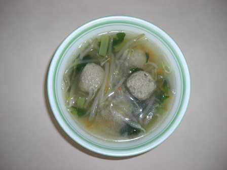 1 肉団子はゆでておく。たまねぎは薄くスライスし、小松菜は葉の1枚1枚をよく洗い2cmに切り、にんじんはせん切りする。 2 水、ガラスープに、にんじん、たまねぎを入れて、アクをとりながら煮る。 3 肉団子を入れてアクをとり、もやしをいれ、調味する。 4 春雨、小松菜を入れる。 |
