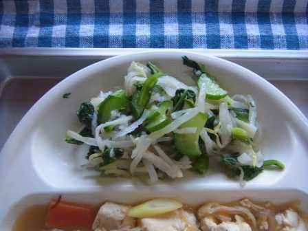 (4人分)小学生1人分の4人分量です。ご家庭で量を加減してお作りください。 こまつな:80g 切干しだいこん:12g りょくとうもやし:80g きゅうり:40g (調味料) 油 :6g(小さじ1・1/2) 酢 :8g(小さじ1・1/2強) 砂糖 :2g(小さじ1/3) 食塩 :1g(小さじ1/6) |