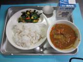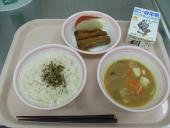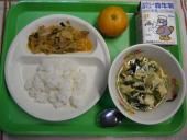 麦ご飯、冬野菜のカレー、ゆで卵、牛乳、わかめサラダ/平成24年11月 仲本小学校給食献立