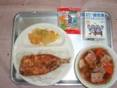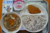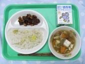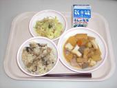 栗ご飯、牛乳、豚肉と大豆の味噌がらめ、けんちん汁/平成23年10月 東宮下小学校給食献立
