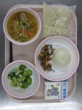 わかめご飯、牛乳、お煮しめ、白菜の浅漬け、もち入りぜんざい/平成24年1月 日進北小学校給食献立