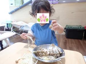今回の食育は「きのこちぎり」です。図鑑で「きのこ」を見せている所です。 本物のシメジ...