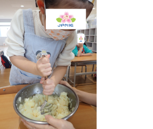 今回の食育は「いももち」です。ホカホカのじゃがいもをマッシュして成形しました。 身支度をし、しっか...