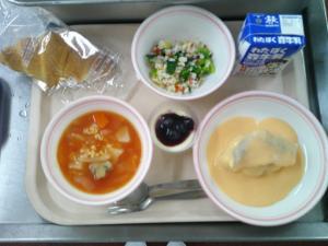 【献 立】 フラワーロール、牛乳、チキンのパイ包みクリームソースかけ、 ヨーロッパ野菜たっぷりのス...