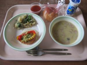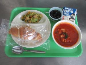 【献 立】 クロワッサン 牛乳 たっぷり野菜のチキンミネストローネ ブロッコリーとかぼちゃのポッ...