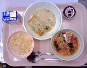 【献 立】 キャロットピラフ、牛乳、チキンのパイ包みクリームソースかけ、 ヨーロッパ野菜たっぷり...