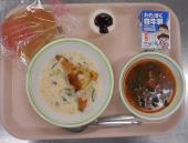 【献 立】 フラワーロール、牛乳、チキンのパイ包みクリームソースかけ、 ヨーロッパ野菜たっぷりのス...