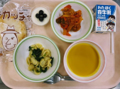 【献 立】 フォカッチャ 牛乳 かぼちゃのポタージュ チキンのローマ風トマト煮込み さいたま市産...