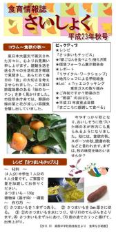 さいたま市食育情報誌「さいしょく H23年秋号」を発行しました!さいたま市の食育情報を季節にあわせて皆さまに発信する「さいたま市食育情報誌 ”さいしょく”」のH23秋号を... 《本号のトピックス》 ★レシピ 「さつまいもチッピス」 ★「朝ごはんを食べよう」強化月間 ★環境フォーラム展示報告会 ★レポー...
